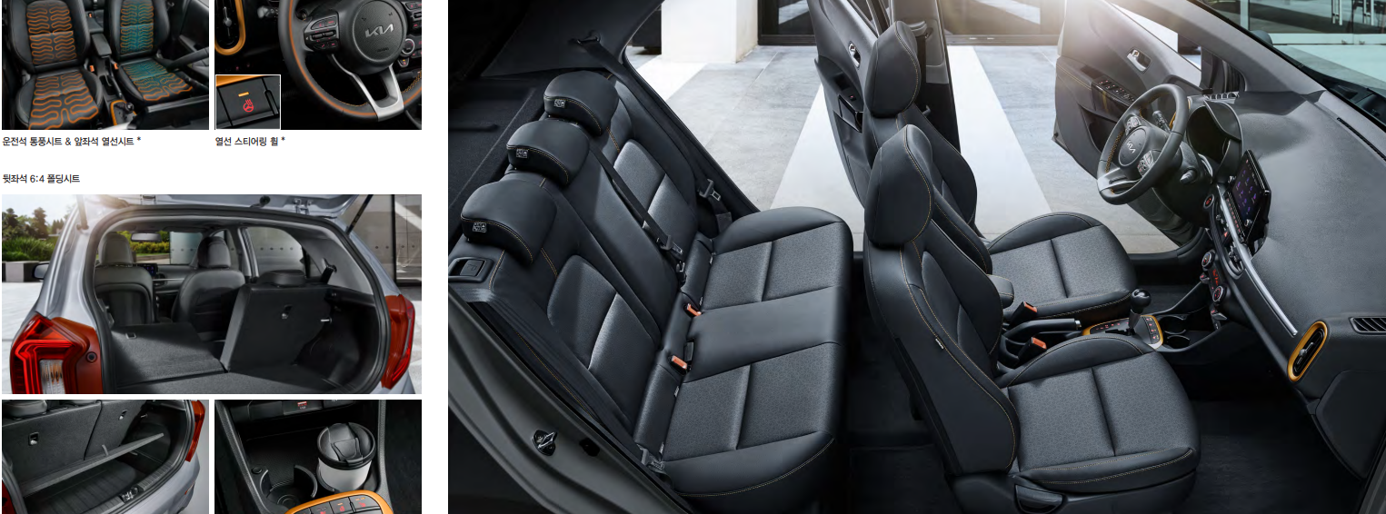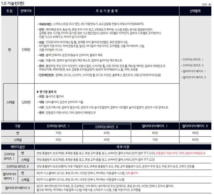 편의 기능으로는 폴딩타입 무선 도어 리모컨키, 수동식 틸트 스티어링 휠, 오토 라이트 컨트롤, 매뉴얼 에어컨, 앞좌석/뒷좌석 파워윈도우, 파워도어록, 파워아웃렛, 속도 감응형 도어잠금장치, 뒷유리 와이퍼&와셔 노즐이 있으며, 인포테인먼트는 컴팩트 오디오, 4스피커, 스티어링 휠 오디오 리모컨, 블루투스 핸즈프리, USB 단자(데이터리딩용)을 사용합니다.